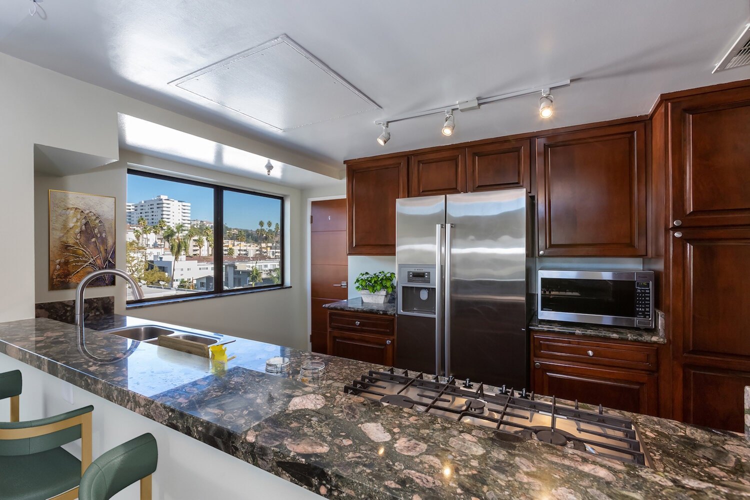 Perched above the city showcasing panoramic views from the Hollywood Hills to the Downtown LA skyline to the Pacific Ocean, this west-facing two-story corner penthouse unit offers an incredible opportunity to live in the heart of LA while enjoying an oversized private rooftop terrace. In the unit, you'll enjoy soaring living room ceilings and towering arched windows offering breathtaking views. Two downstairs bedrooms are well-positioned to provide privacy for families or guests. Upstairs, you'll discover a loft perfect for a third bedroom, office, workout space, media room, or meditation retreat with direct access to the sparkling rooftop pool, spa, and sundeck. Located just steps from Runyon Canyon and nearby all the popular shops and restaurants of the iconic Sunset Strip in Hollywood and nearby Sunset Plaza, this rare offering is destined to become someone's dream home.